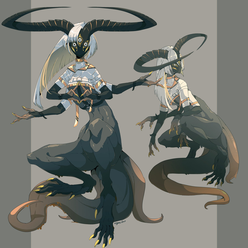 Curio has a relatively humanoid, somewhat feminine torso and head. Her torso is slender and host to two pairs of arms, each terminating in clawed hands with three digits a piece.