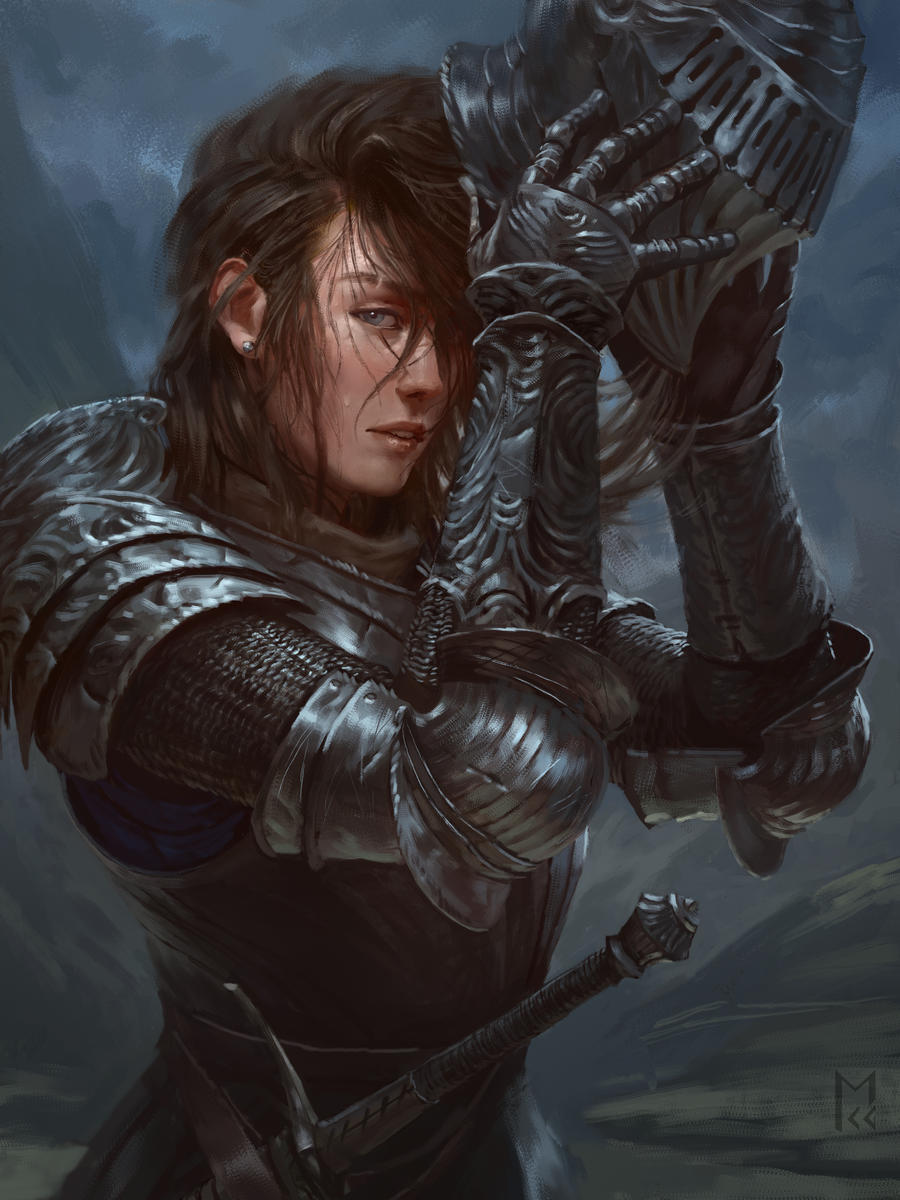 An orphaned Mourner, she carries the soul of her mother in her armor, vowing to put the land right with her help. Having been raised by the spiritsmiths since her mother's death and father's disappearance, Iruna has always known what she was meant to be, and performs her duty with both solemnity and fury.